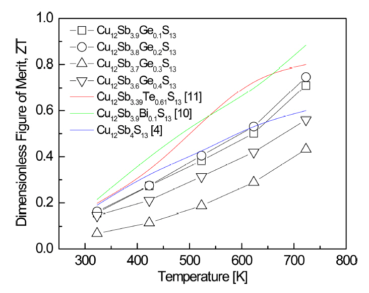 in a decrease in power factor. As a result, the highest ZT (0.74) was achieved at 723 K for Cu12Sb3.8Ge0.2S13.