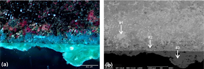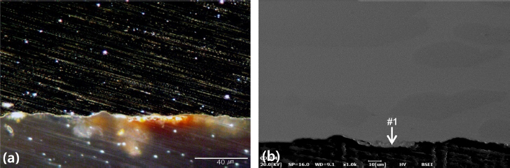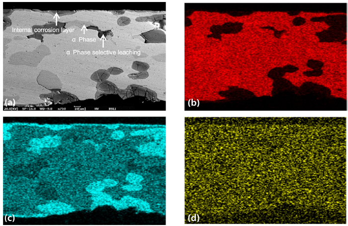 Sg-1은 소지금속과 내부 부식층으로 구성되어 있다 (그림 2a). Cu는 α상 선택 부식된 부분을 제외하고 소지금속에 고루 분포한다 (그림 2b). α상 선택 부식된 위치에 적색 부식생성물이 관찰되며(그림 3a), 주요 성분으로 Cu 36.55 wt%, Sn 48.62 wt%, O 11.89 wt%로 α상에 비하여 Cu 함량은 약 48.31 wt% 낮고