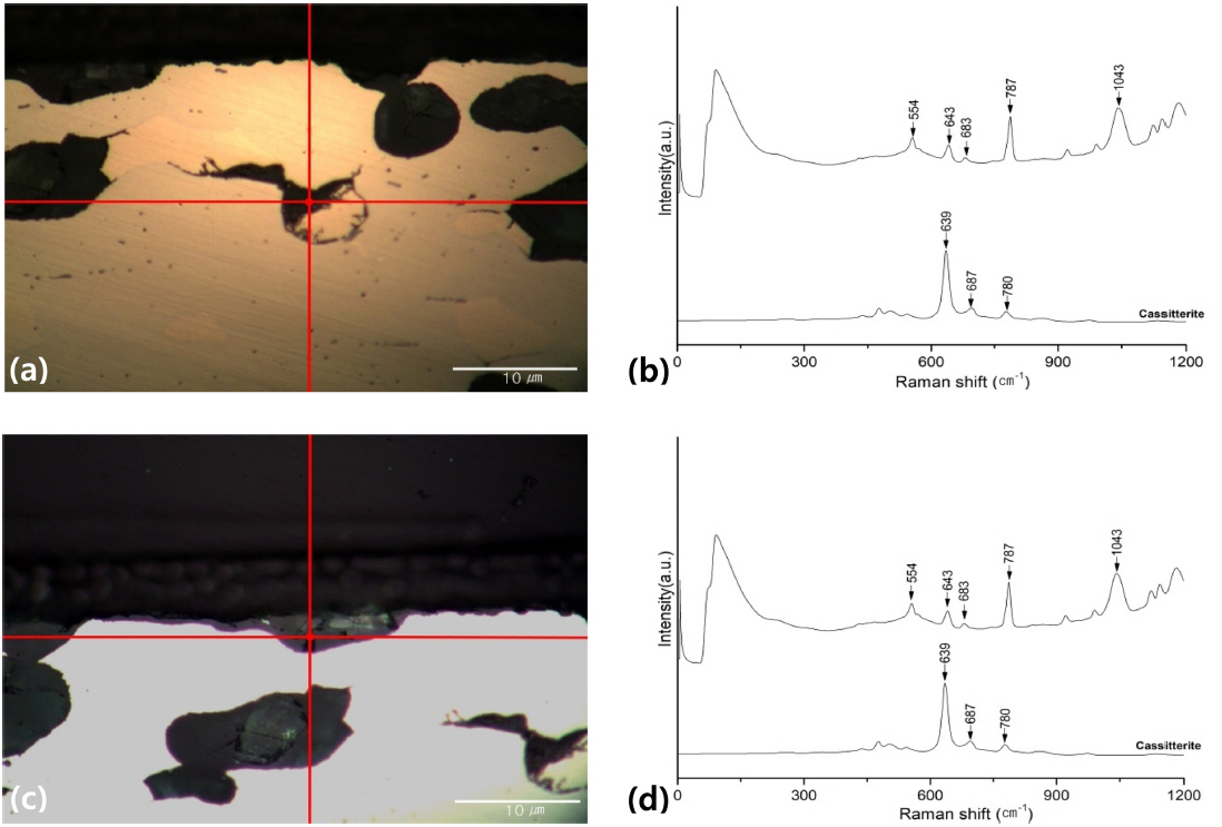 산화주석 부식층은 라만 분광 분석에서 554, 643, 683, 787, 1043 cm-1의 peak가 확인되는데, 이는 The RRUFF™ Project에서 제시하는 Cassiterite(SnO2)의 639, 687, 780 cm-1의 peak와 차이를 나타낸다. 나노 입자의 경우 기존 peak 값과 차이가 발생할 수 있으며 Nano-SnO2 경우 482, 486, 568, 622, 706 cm-1의 peak가 나타난다고 한다 [8]. 따라서 산화주석 부식층은 Cassiterite(SnO2)로 구성되며 나노 입자로 인하여 기존 peak와 차이를 나타낸 것으로 보인다.
