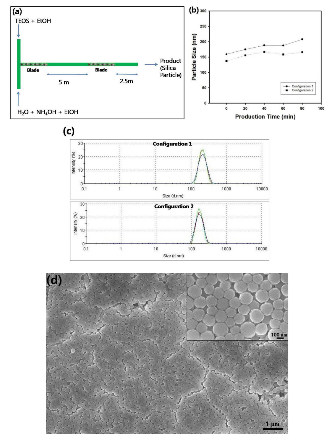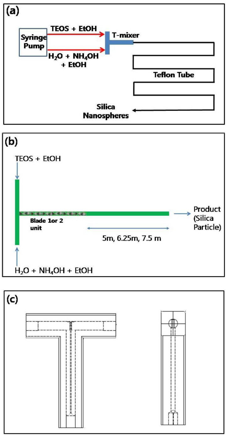 its effect on the diameter of silica particles as a function of production time. Figure 10(a) contains the schematic figure of ‘configuration 2’ for the T-mixer combined with tubular reactor. In ‘configuration 2’, one blade unit (7 cm in length) was inserted inside T-mixer which is connected