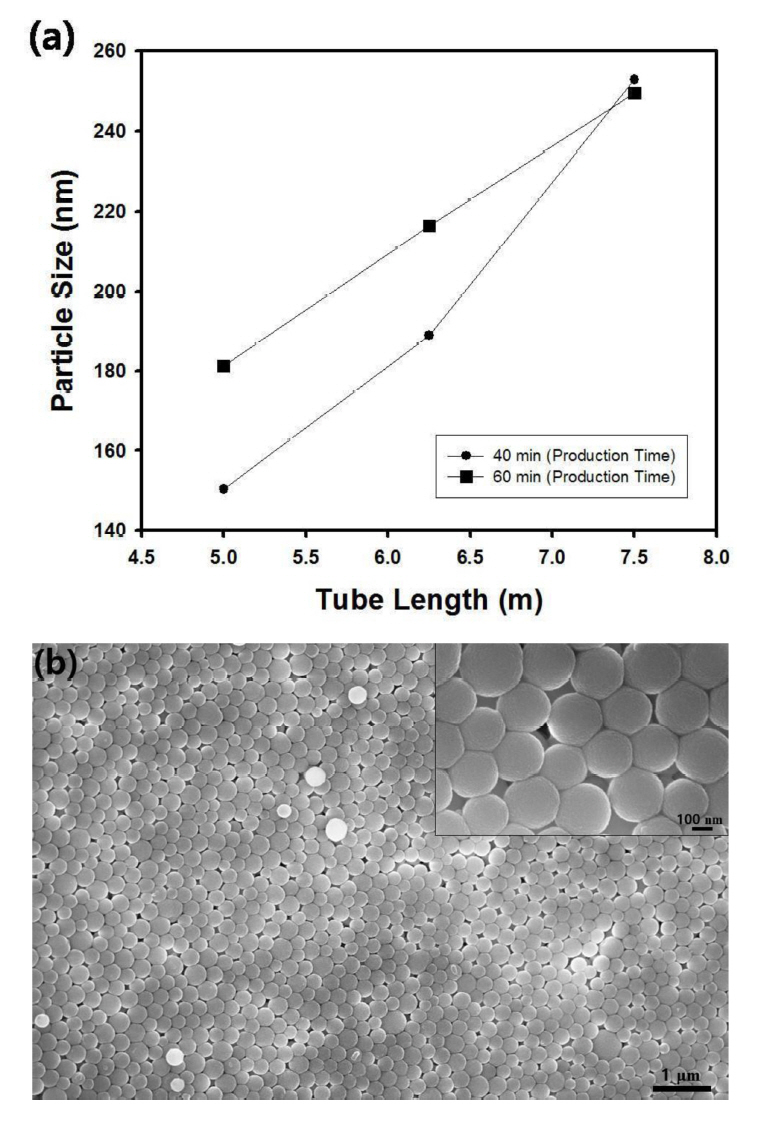 and size distribution of silica particles. Figure 5(a) displays the average particle size of the silica nanospheres as a function of production