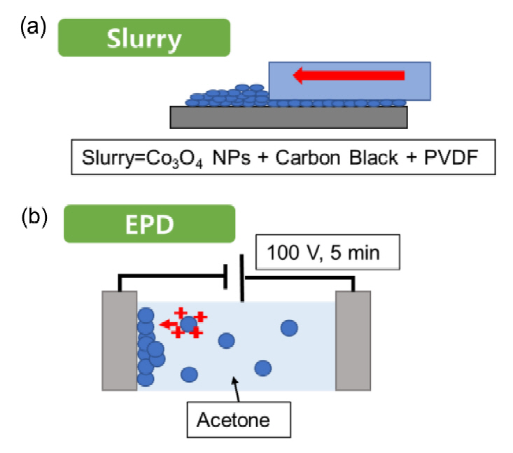 우리는 첨가제를 사용하지 않는 활물질만 포함하는 EPD 방식과 기존의 slurry를 이용한 전극 증착 제조법을 비교하였다. 전기장을 이용하여 집전체와