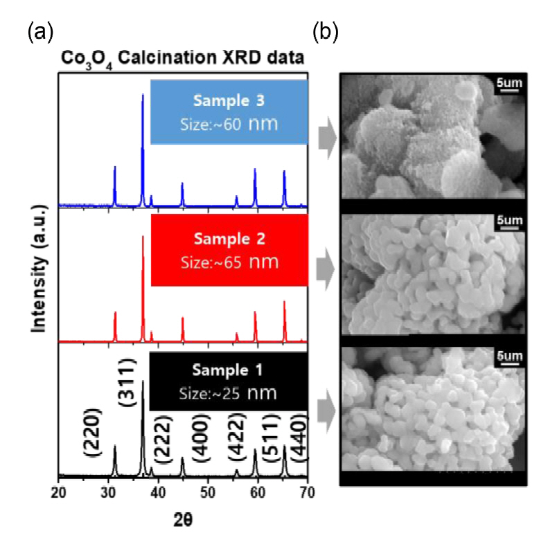 (sample 3) 세가지 다른 Co3O4 분말의 결정립 크기와 상을 관찰하였다. Sample 2의 경우 결정립 크기가 25 nm (sample 1)에서 65 nm로 성장하는 것을 그림 2(a) (311)에서의 X-ray diffraction (XRD) 데이터 에 기반한 Debye-Scherrer Method를 통해 확인하였다 [19,20]. 그림 2(b)에 보여진 scanning electron microscopy (SEM) image분석을 통해서는 Co3O4 분말의 입자크기의 명확한 차이는 확인하기 어려웠지만 열처리 후 입자들 간의 coalescence로 인해 뭉친 입자의 사이즈가 증가된 것이 확인된다.