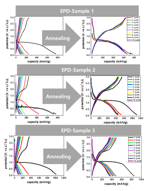 반면 EPD 증착의 경우 급속 냉각 시편을 제외하고는 열처리 여부와 관계없이 (결정립 사이즈와 상관없이) 유사한 용량과 사이클 안정성을 보여주었다.