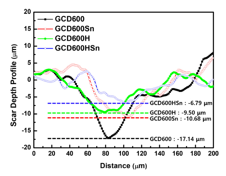 µm. In contrast, the depth of the pin in the GCD600HSn specimen, which had the highest