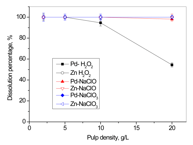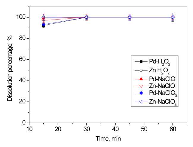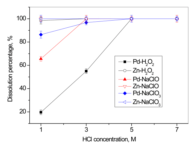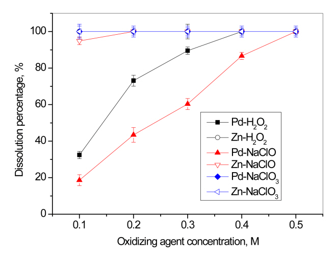 had a significant influence on the dissolution of Pd and Zn. In the case of H2O2 and NaClO3, Fig 1 shows that the dissolution of Pd increased from 19.6 to 100% and from 86.4 to 100%