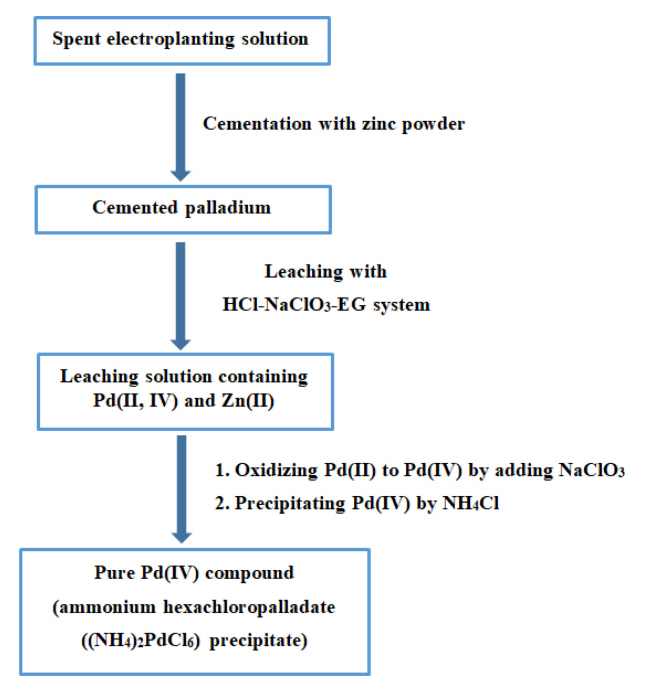 Among the three oxidizing agents, NaClO3 showed the best leaching efficiency and thus the leachate containing NaClO3 was selected for recovery of the Pd(IV) compound by precipitation with NH4Cl. Our obtained data indicated that the recovery of pure Pd(IV) compound by leaching