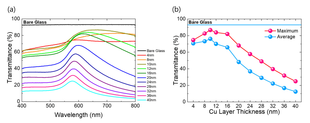 가시광선 평균투과도와 최고 투과도값을 Fig 2(b)에 정리하였다. 주목할 점은 Cu층의 두께가 약 10 nm까지 증가할 때는 두께의 증가가 투과도의 증가를 유발하는 반면, 10 nm 이상의 두께에서는
