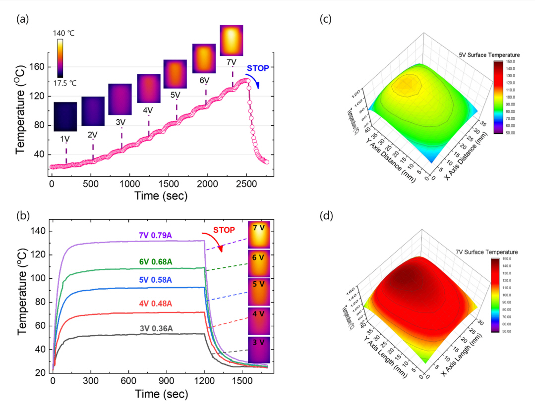 최종 온도의 약 90%에 도달하였으며, 최종 온도 구간에 도달후에는 매우 안정적인 정상 상태 (steady-state)의 발열 특성을 보여준다. Fig 3(c)-(d)는 5V와 7V의 전압을 인가할 때의 발열 균일도 (thermal uniformity)를 나타내는 데, 발열체의 테두리 부분이 외부 공기와의 접촉으로