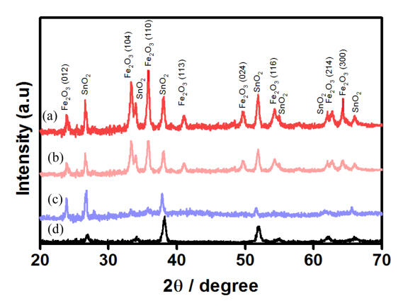 (d) bare FTO glass. T-F HT sample (b) exhibits enhanced crystallinity of hematite