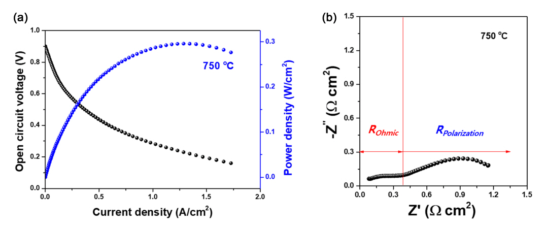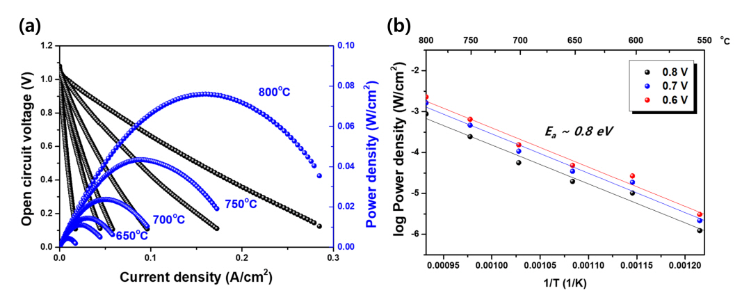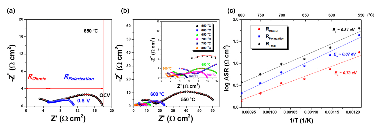 있다. 고온인 800 °C에서도 셀 전체저항은 약 12.4 Ω·cm2이었다. 이 온도에서의 오믹저항은 약 4.5 Ω·cm2 였다. 이와 같은 큰 저항때문에 낮은 셀 출력이 얻어졌다. 그림 4(c)에 오믹저항 및 분극저항을 온도에 따라 나타냈다. 볼 수 있는 것처럼 오믹저항의 활성화에너지는 약 0.73 eV이다 (저항의 활성화에너지는 아레니우스