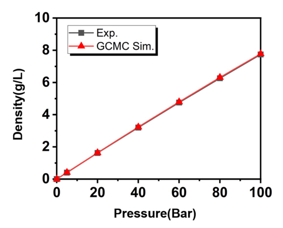 진공 상태에서의 수소 밀도값을 구하였고 실험값과 비교하였다. 그 결과, Fig 2와 같이 20 °C 온도 조건에서 GCMC시뮬레이션을 통해 유추된 수소의 밀도값이 실험값과 매우 유사함을 확인할 수 있었다. 이 때, 실험값은 NIST
