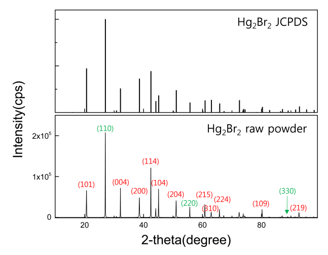 The diffraction pattern of the raw Hg2Br2 powder materials was obtained before the purification. Fig 1 compares the measured XRD peaks of the Hg2Br2 raw powder and ideal Hg2Br2 JCPDS peaks. (110) and (220) planes corresponding to the primary peaks of Hg2Br2 exactly matched the Hg2Br2 JCPDS peak, and other peaks such as (101) and (114) were also clearly detected. In