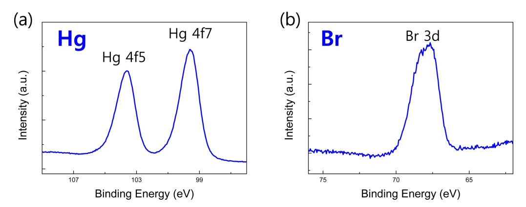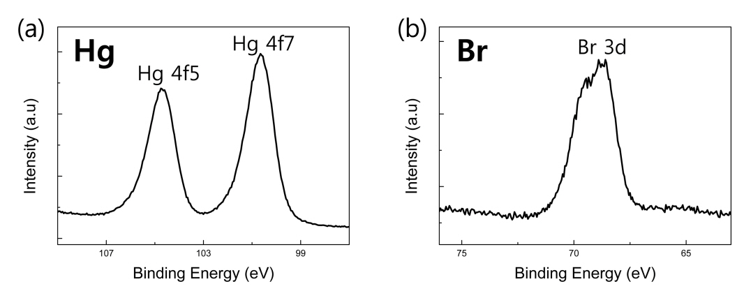 X-ray photoelectron spectroscopy (XPS) spectra of the (a) Hg 4f and (b) Br 3d orbitals