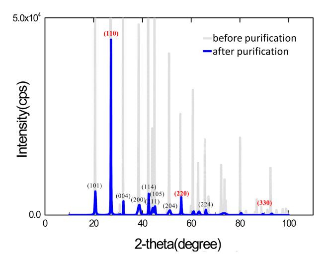Comparison of XRD spectra of Hg2Br2 before and after purification.