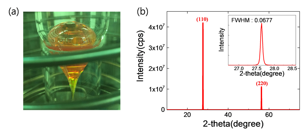 (a) Physical vapor transport (PVT)-grown Hg2Br2 crystal in quartz ampoule using purified Hg2Br2 powder. (b) X-ray diffraction (XRD) spectra of Hg2Br2 crystal. Inset shows full width at half maximum (FWHM) value.