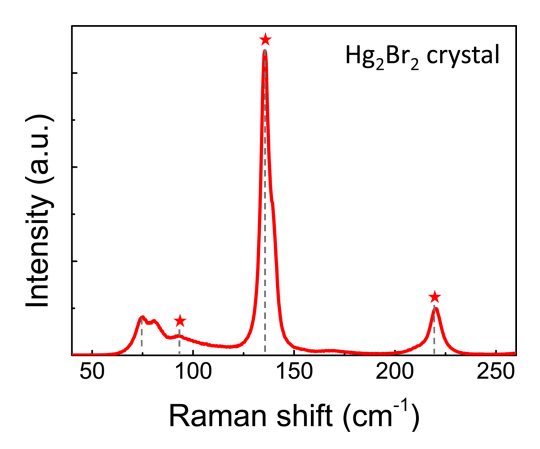 Raman spectra of Hg2Br2 crystal. The major peaks in Hg2Br2 crystal are marked with asterisks.