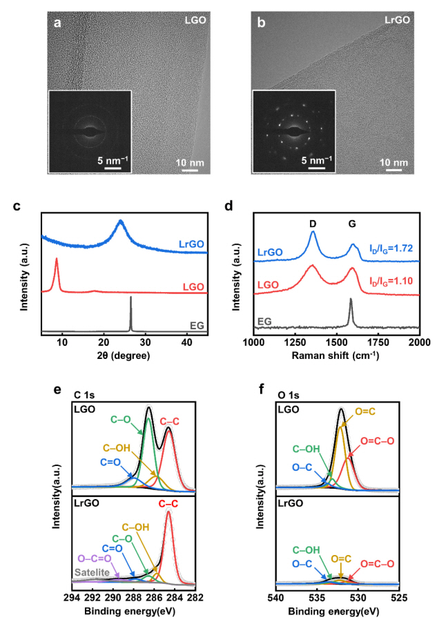 LGO는 비교적 낮은 결정성으로 비정질 패턴을 보여주는 반면, LrGO는 화학적 환원에 의해 대부분의 산소 작용기가 제거되어 결정성을 회복하고 결정질
