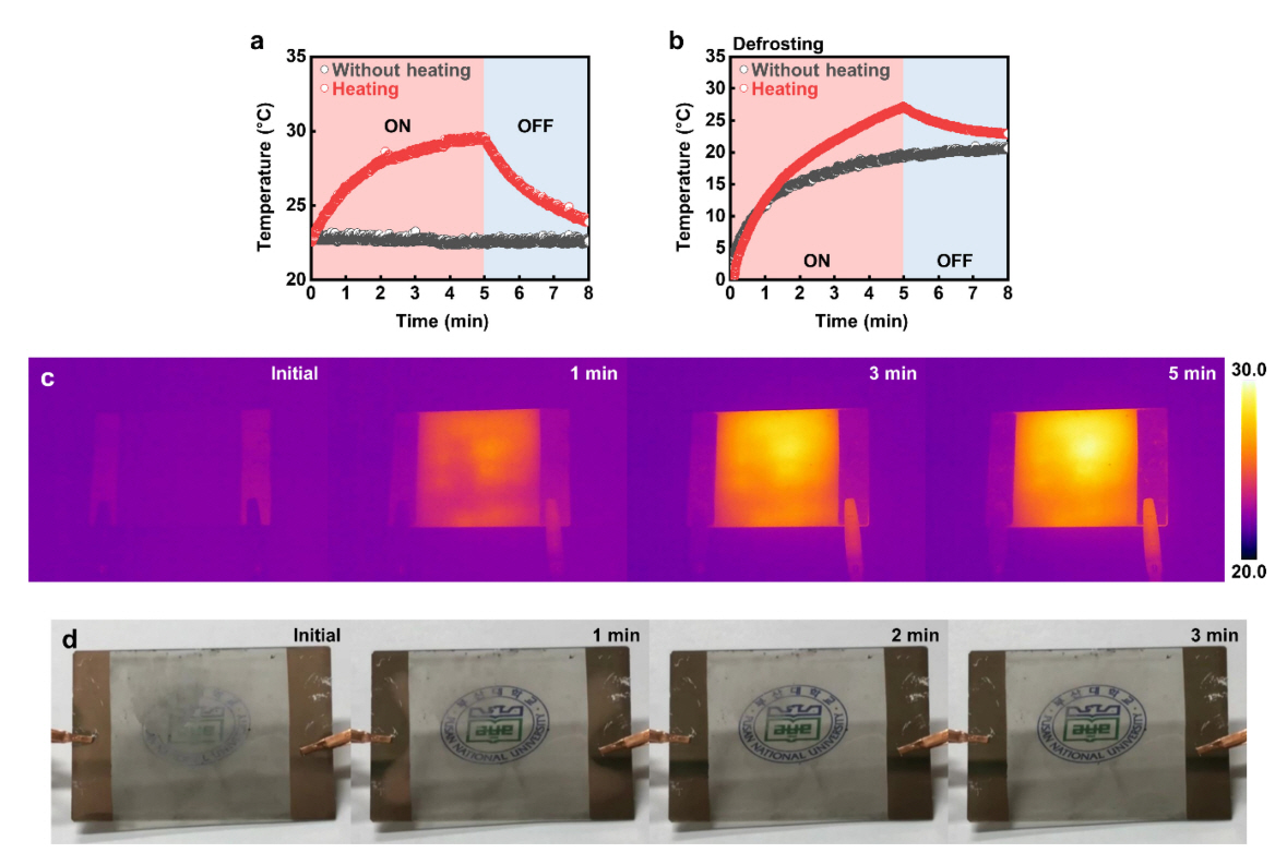 온도가 10°C 상승하였고 표면에 형성된 성에가 약 1분 만에 대부분 제거되는 것을 확인하였다. 이러한 결과들을 바탕으로, 기존의 투명 전극 소재로