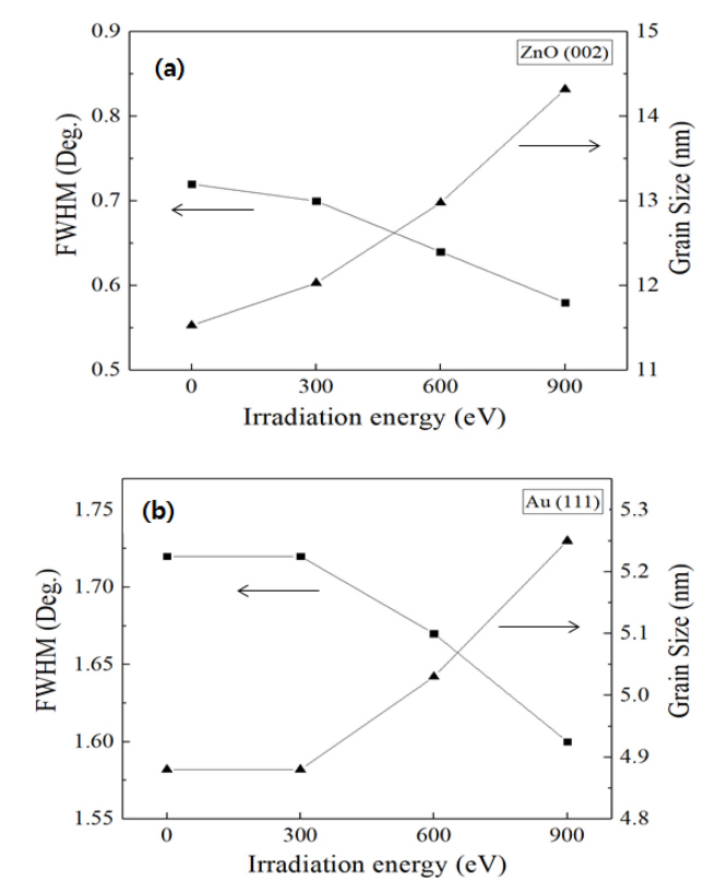 Average grain size and full width at half maximum of the ZnO (002) (a) and Au (111)