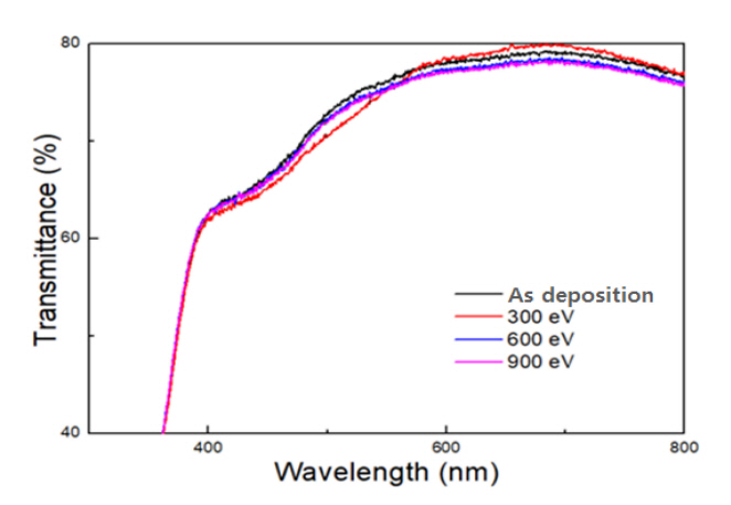 visible transmittance of 79.0%. Although the as deposited and electron irradiated