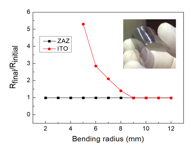 ZAZ film, 100 nm thick ITO films were deposited on PI films with the same ZnO sputtering
