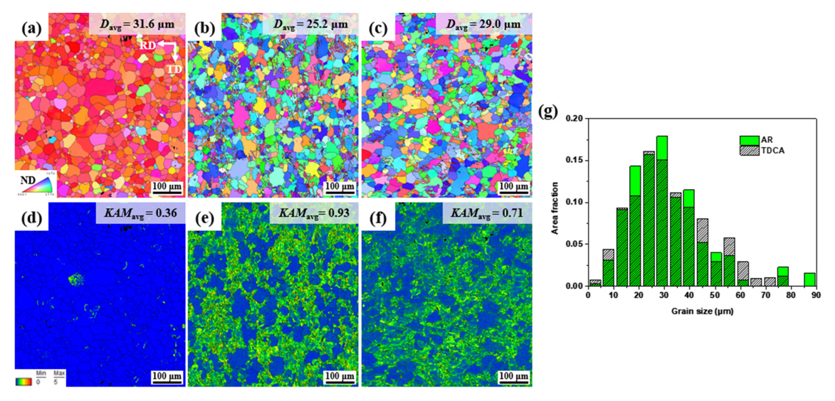평균 결정립 크기는 각각 25.2 µm과 29.0 µm로 AR의 평균 결정립(31.6 µm)보다 미세하다. 그림 2(g)는 AR과 TDCA의 결정립 크기분포를 나타낸 것이다. 선압축 후에 적용된 열처리 과정에서 전위밀도가 낮은 결정립들의 결정립계가 전위밀도가 높은 결정립으로