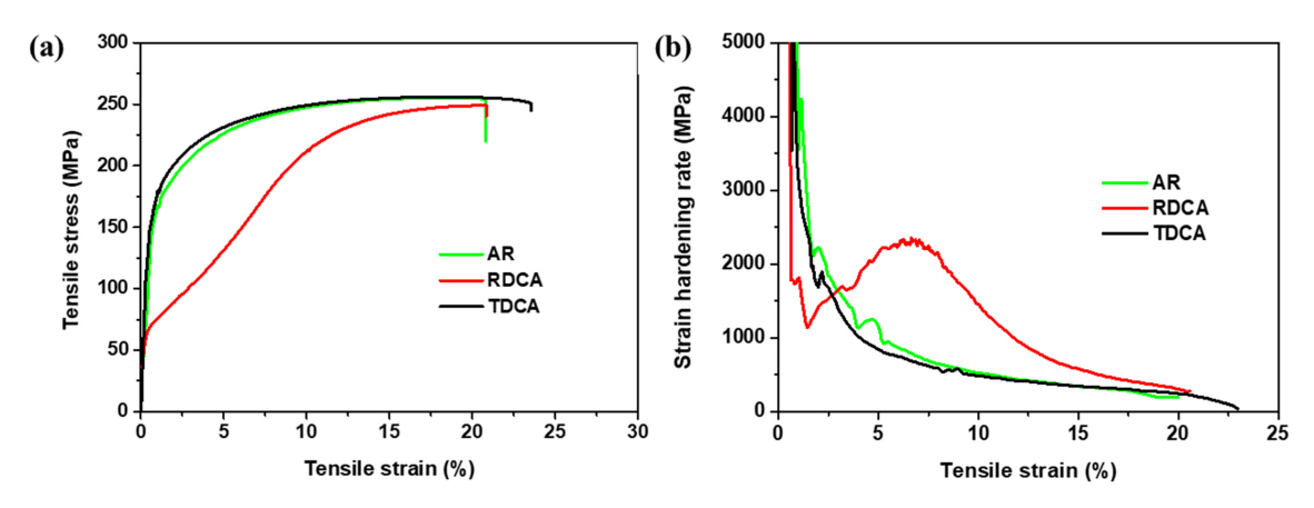 (a) Tensile stress-strain curves and (b) corresponding strain hardening rate curves