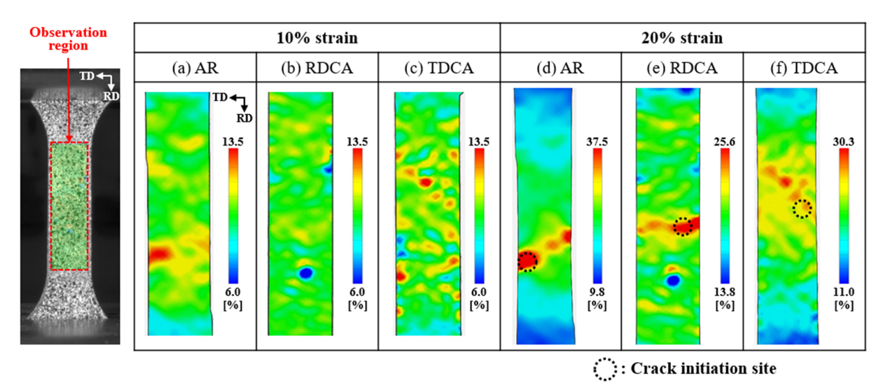 RD strain distributions obtained by DIC analysis after (a-c) 10% and (d-f) 20% tensile
