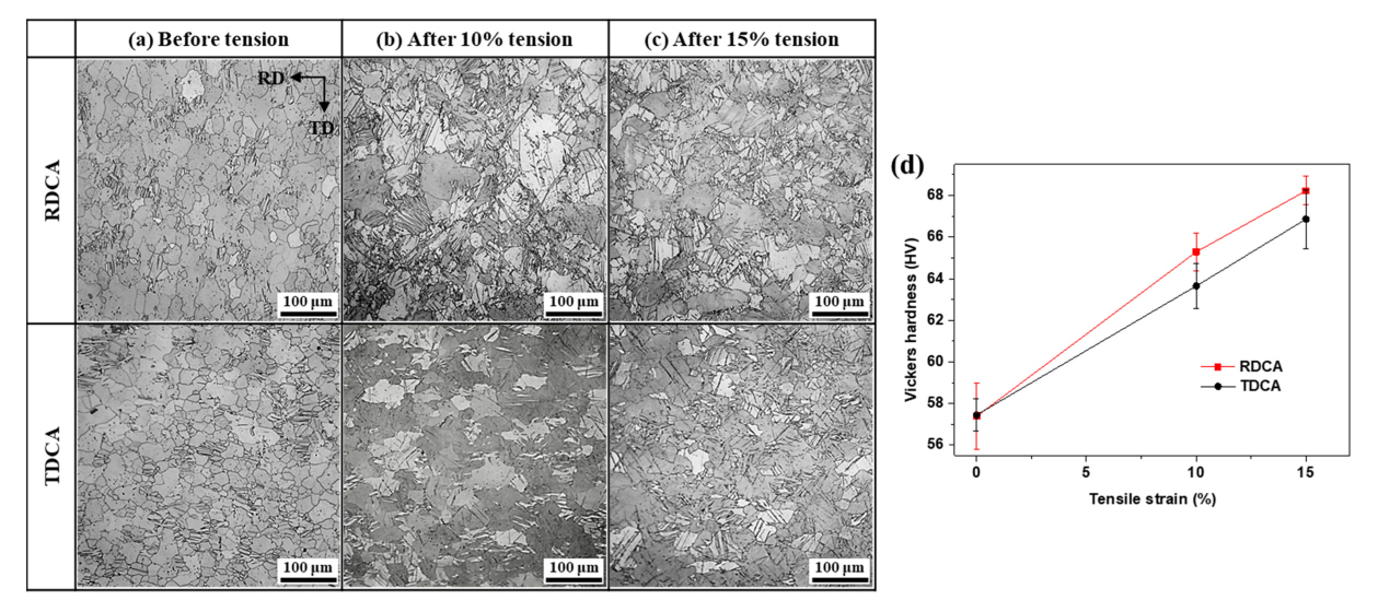 비커스 경도 측정은 변형 전과 10%, 15% 인장 변형된 AR과 TDCA 시편을 0.5 kgf 하중과 10초의 지속시간(duration time)으로