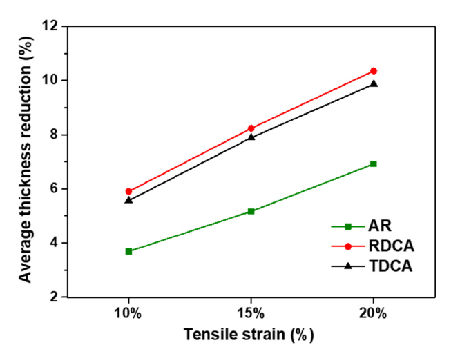 Variations in average thickness reduction of AR, RDCA, and TDCA samples with applied