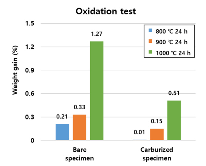그림 10은 Carbon 팩 세멘테이션 시편 및 모합금 시편의 800 °C, 900 °C, 1000 °C 등온 산화 실험 결과 그래프이다. 800 °C, 900