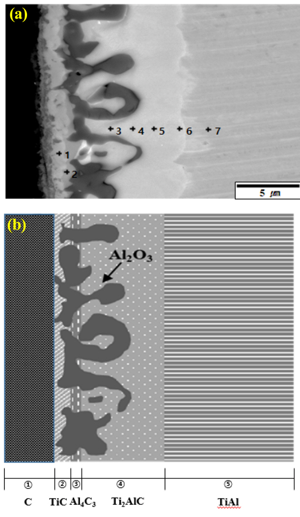 그림 8에서, TiC 형성 이후 확산 경로는 2 종류로 나뉘게 된다. 첫번째는 Al rich 영역의 Al4C3 및 Al2O3가 형성된 후 Ti2AlC, TiAl 경로를 따르는 경우이다. 두번째는 Ti rich phase인 Ti2AlC가 형성된 후 TiAl 경로를 따르는 경우이다. 각각의 경로를 ②, ②´으로 표기하였다. 특히 Al rich 경로의 경우, 그림 6의 단면 미세조직 상에서 Al2O3 형성 이후 그 아래 Ti2AlC 층이 형성되므로, 그림 8의 ④, ⑤ 번 확산 경로를 따르는 것으로 사료된다.