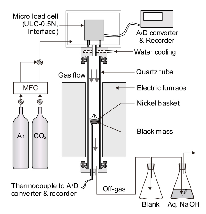 본 실험에서 사용한 시료는 Li 6.86 wt%, Ni 51.64 wt%, Co 5.58 wt%, Mn 1.48 wt%가 함유되어 있는 사용전의 NCM(LiNixCoyMnzO2)계 양극재 분말이다. 온도에 따른 양극재 분말의 분해, 환원, 탄산화 등에 따른 무게 변화는 자체 제작한 열중량 분석장치를 사용하였으며, 그림 1에 장치의 모식도를 나타내었다. 반응에 따른 시료의 무게 변화는 마이크로 로드셀(ULC-0.5N, Interface)을 사용하여 측정하였다.