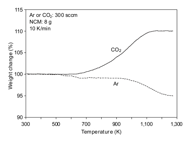 그림 2에는 NCM계 양극재 분말을 Ar 및 CO2 분위기에서 10 K/min 속도로 1,273 K까지 열중량 분석한 결과를 나타내었다. NCM 분말을 Ar 분위기에서 가열한 경우 약 650 K까지