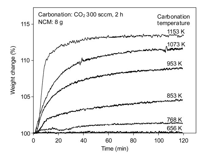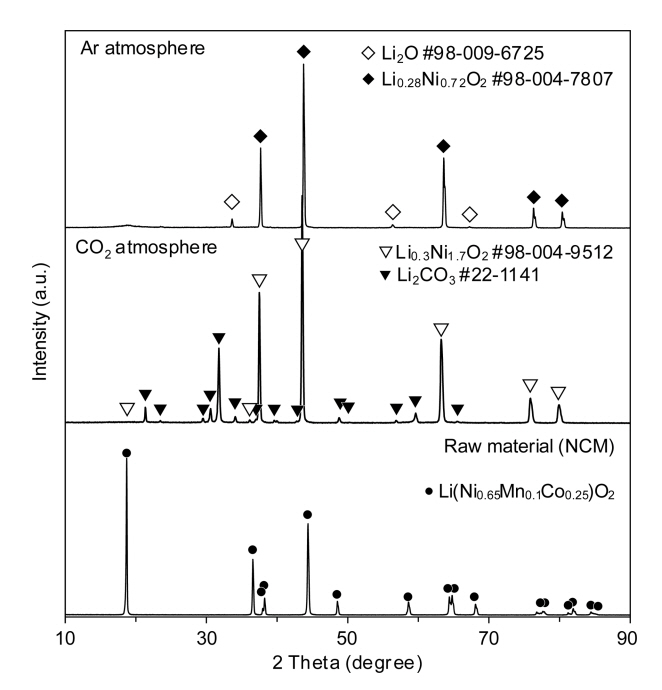 것을 알 수 있다. 이러한 결과는 반응 온도의 상승과 함께 NCM의 분해 반응이 보다 활성화되고 더욱이 CO2 분위기에서 탄산화 반응이 촉진되었기 때문으로 생각된다.