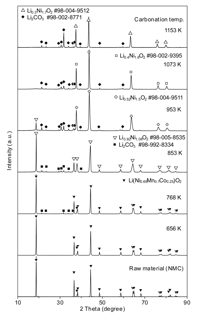 NCM과 거의 동일한 것으로 생각된다. 853 K에서는 NCM과 유사하지만 Li이 Li2CO3가 되어 침출되었기 때문에 Li이 약간 부족한 Li1-xM1+xO2의 새로운 NCM상이 생성된 것으로 추정된다. 그 이상의 온도에서도 Li의 감소에 따라 Ni이 높은 NCM이 생성된 것으로 추정된다. 이러한 결과는