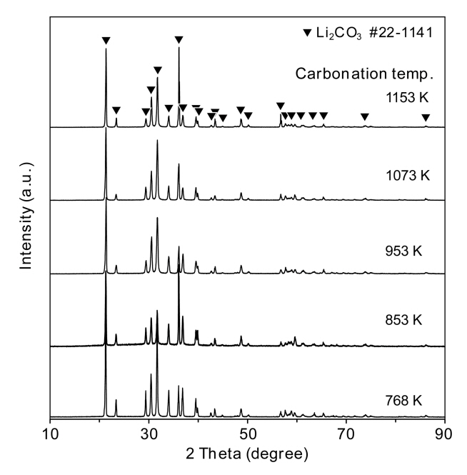 그림 9에는 회수한 Li2CO3의 X-선 회절 분석 결과를 나타내었다. 그림에서와 같이 탄산화 온도와 무관하게 순수한 Li2CO3가 생성된 것을 알 수 있다. 그리고 1,153 K에서 탄산화하여 회수한 Li2CO3를 ICP로 분석한 결과 미량의 Al이 함유되어 있으나 99.95% 이상의 순도를 나타내었다.