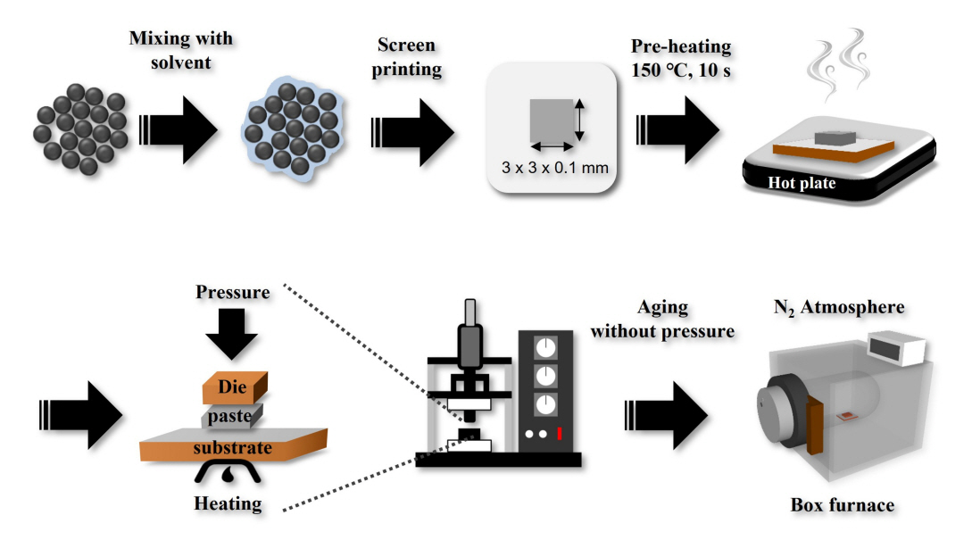 열처리 시간은 30분 및 60분으로 설정하였다. 상기 실시된 소결접합 공정을 모식도로 요약하면 그림 2와 같다.
