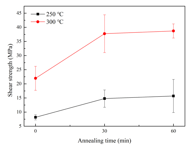 및 열처리 온도와 열처리 시간에 따른 접합부 전단 강도 측정 결과를 그림 5에 나타내었다. 250 °C에서 10초동안 가압 소결접합한 직후 접합부는 평균 8.15 MPa의 전단 강도값을 나타내어 불충분한 접합력을 나타내었으나,