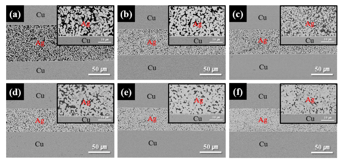 형성된 접합부 미세조직(그림 6(a))에서는 Ag 입자들간의 소결이 발생하였으나, 충분히 진행되지 않아 상대적으로 매우 큰 공극률을 나타내었다. 그러나, 가압력의 영향으로 불규칙한 조대