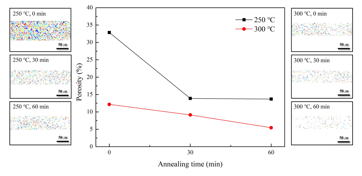 이후 상기 시편을 30 및 60분 동안 열처리하였을 경우 접합부(그림 6(e) 및 6(f))의 공극률은 추가적으로 감소하였는데, 이는 삽입된 확대 이미지에서 더욱 명확히 확인할 수 있다.