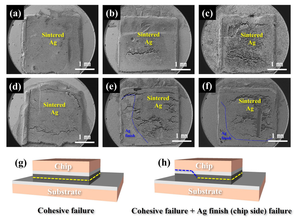 Roh 등이 300 °C 질소 분위기 하 무가압 조건에서 60분간 소결접합을 실시하여 18.6 MPa의 전단 강도값을 얻은 것을 고려할 때[25], 본 연구에서 제안한 Ag 필러 소재와 짧은 가압 소결접합 후 열처리 공정은 기존 공정 대비 매우 효율적이면서 생산성을 향상시킬 수 있는 공정으로