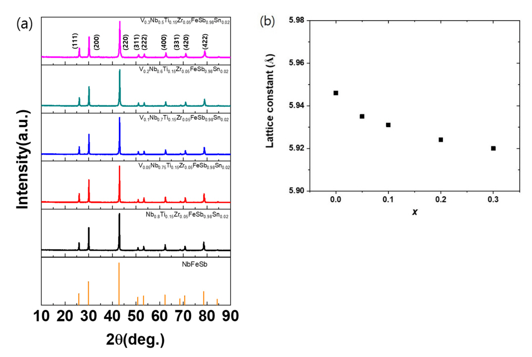 Figure 1(a) shows the XRD patterns of the sintered Nb0.8−xVxTi0.15Zr0.05FeSb0.98Sn0.02 samples. All the major peaks are indexed according to the reference pattern of NbFeSb