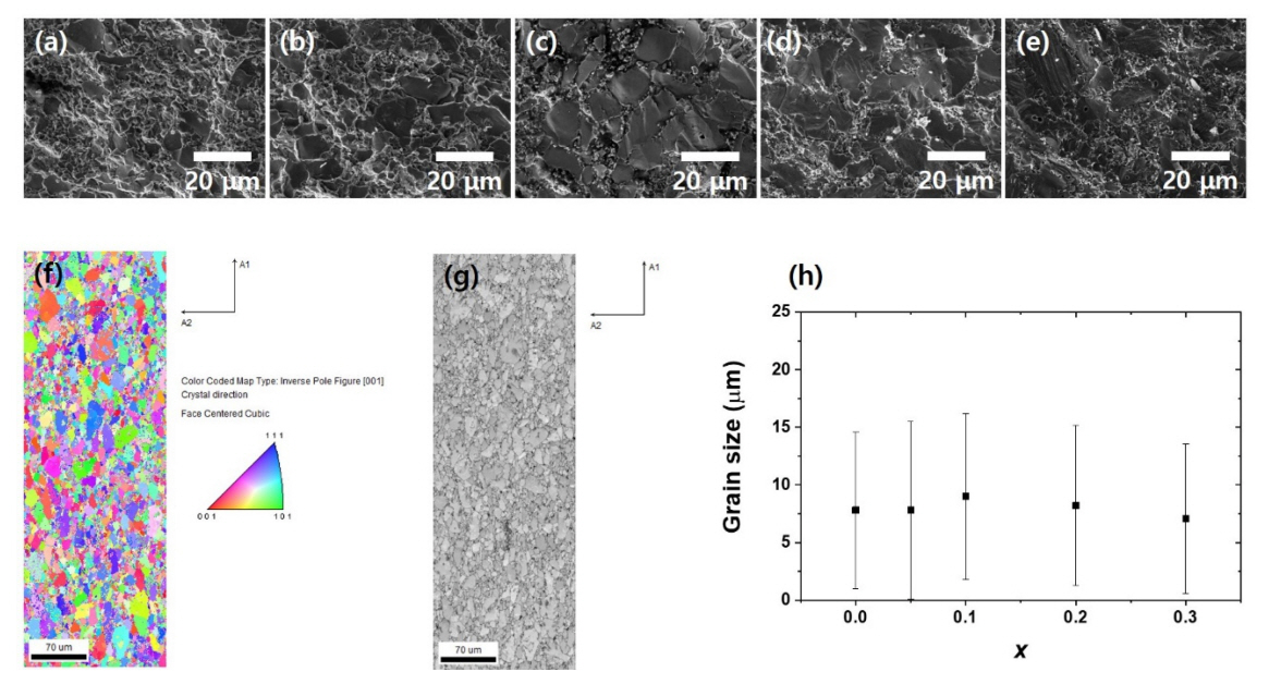 Figures 2(a)–(e) show the microscopic morphology of the fractured surfaces of the Nb0.8−xVxTi0.15Zr0.05FeSb0.98Sn0.02 samples, which were observed using FE-SEM. Large grains with diameters of >10 μm