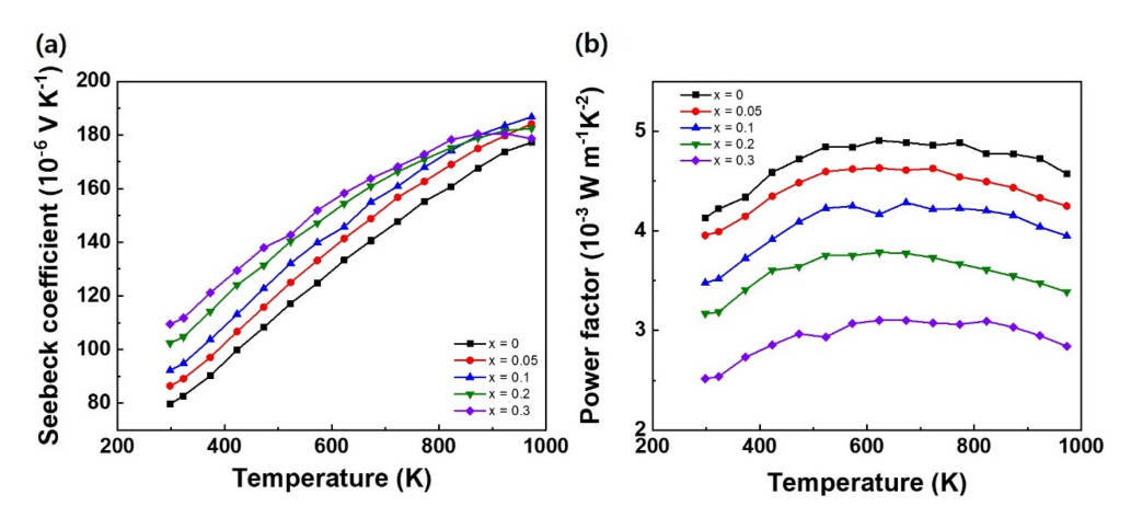 Figure 4(a) presents a comparison of the S of the Nb0.8−xVxTi0.15Zr0.05FeSb0.98Sn0.02 samples from 298 to 973 K. Overall, S increases with x over the entire temperature range when x ≤ 0.1. The maximum S (Smax) was observed at the highest measurement temperature of 973 K, reaching 186.7 μV