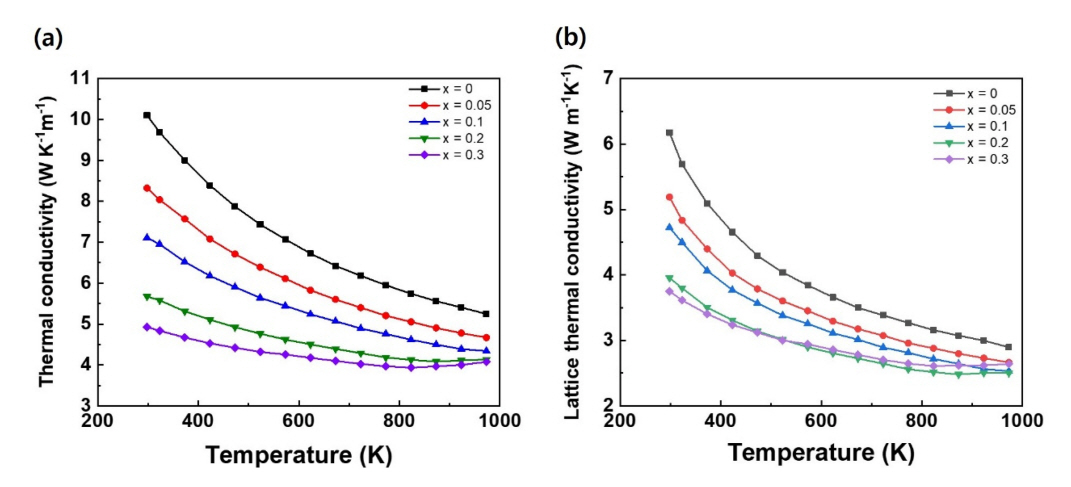(κ) decreases with temperature in all the samples, and the maximum κ (κmax) is observed at 298 K. The κmax of the V-free sample is ~10.1 W K−1 m−1. However, adding a small V content causes a considerable decrease in κmax, as seen in the Nb0.75V0.05Ti0.15Zr0.05FeSb0.98Sn0.02v sample, whose κmax was reduced by ~17.5% to a value of 8.33 W K−1 m−1. A more dramatic reduction in κmax was observed in the V-rich samples, and the κmax value of the Nb0.5V0.3Ti0.15Zr0.05FeSb0.98Sn0.02 sample was reduced by more than 50% to ~4.93 W K−1 m−1 by V alloying. Notably, κ comprises three components— contributions from the lattice (κlat), majority carrier (κel), and bipolar conduction (κbi). Therefore, an independent estimation of each component is required to establish