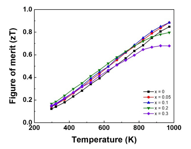 the samples with x < 0.1 had a higher zTs than those of the V-free sample over the entire temperature range. The maximum zT value of 0.89 was observed in the Nb0.75V0.05Ti0.15Zr0.05FeSb0.98Sn0.02v and Nb0.7V0.1Ti0.15Zr0.05FeSb0.98Sn0.02 samples at 973 K, which is ~5% higher than that of the V-free Nb0.8Ti0.15Zr0.05FeSb0.98Sn0.02 sample. Although the improvement is insignificant, we believe that a small V content