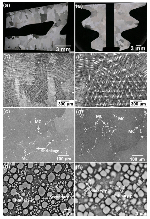 평가하기 위해 블레이드 Airfoil부와 Root부에서 결정립(Grain)과 수지상(Dendrite), 탄화물(Carbide) 그리고 γ'을 분석하였다.