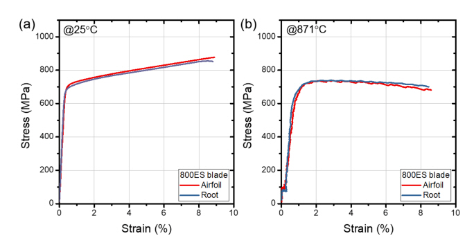 시험에 따른 데이터 편차 범위 내에서 유사한 것으로 판단된다. 인장 강도는 상온 대비 871 °C 시험에서 Airfoil과 Root부의 인장 강도가